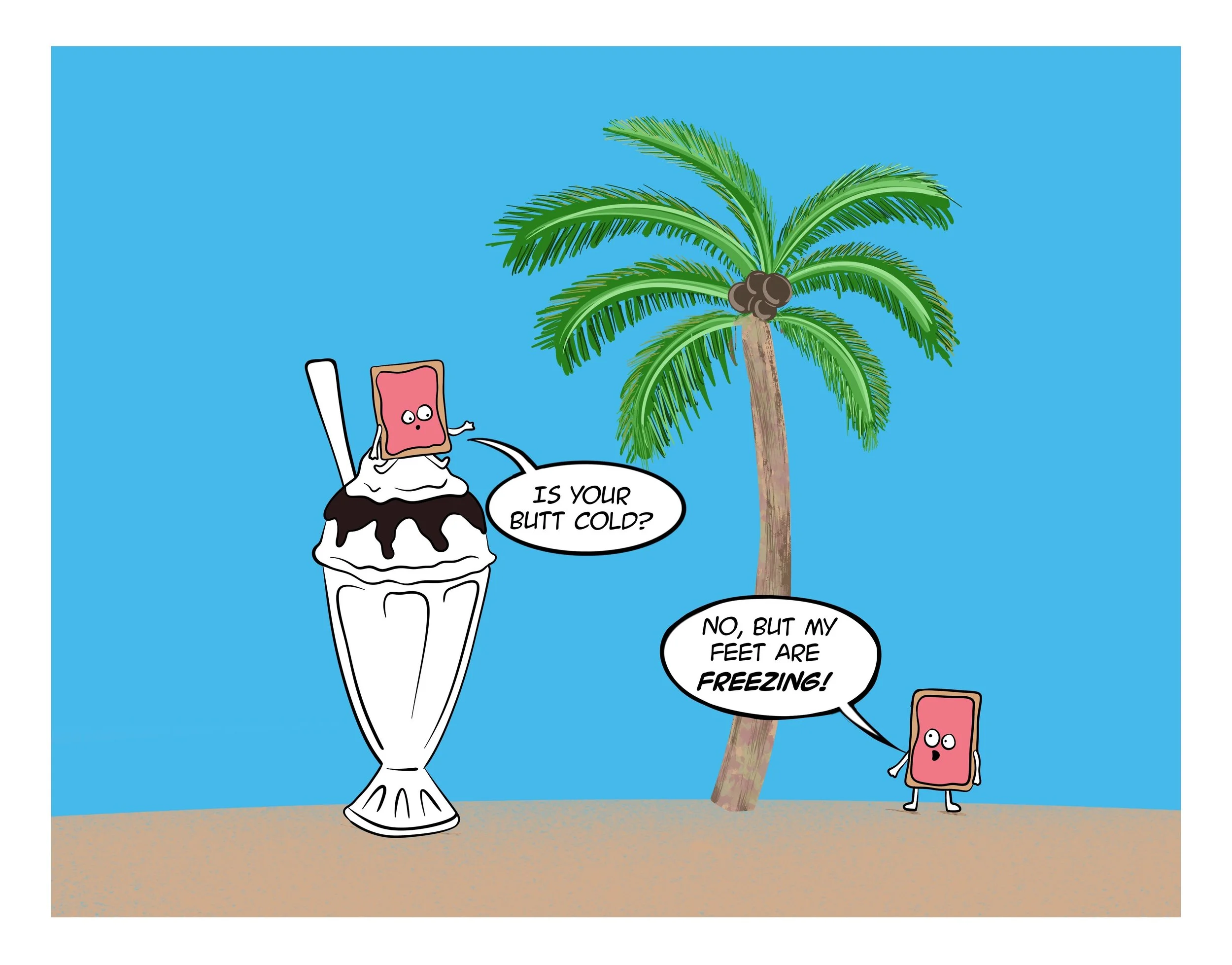 Back to my art… in 2006, pop tarts put out some of the best print ads I have seen to this day. Super simple and funny. The original ad (third slide) was two pop tarts sitting on top of ice cream sundaes as the “cherry” on top. One pop tart looks at the other and asks “is your butt cold?” (See my recreation of the original ad, plus other versions and a timelaspe video below).