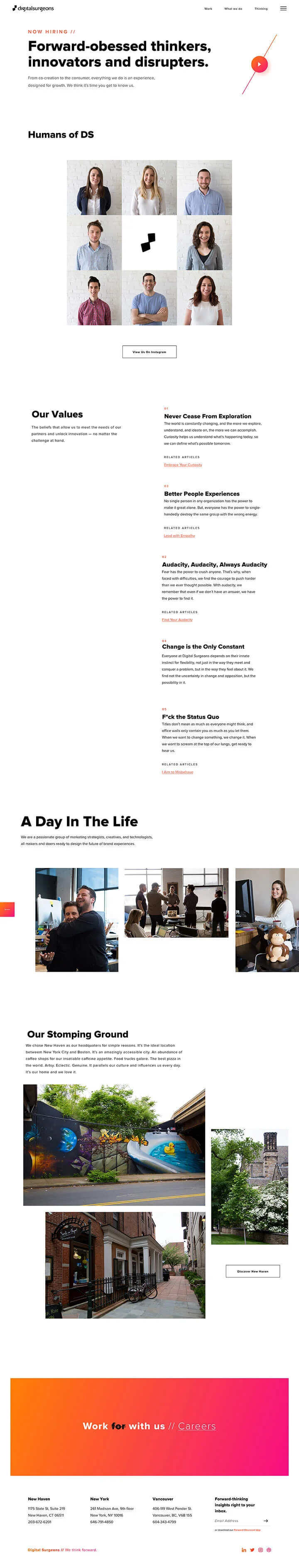 The first iteration of the microsite included quotes of why people enjoyed working for DS, position openings, the company’s Instagram feed, and more.