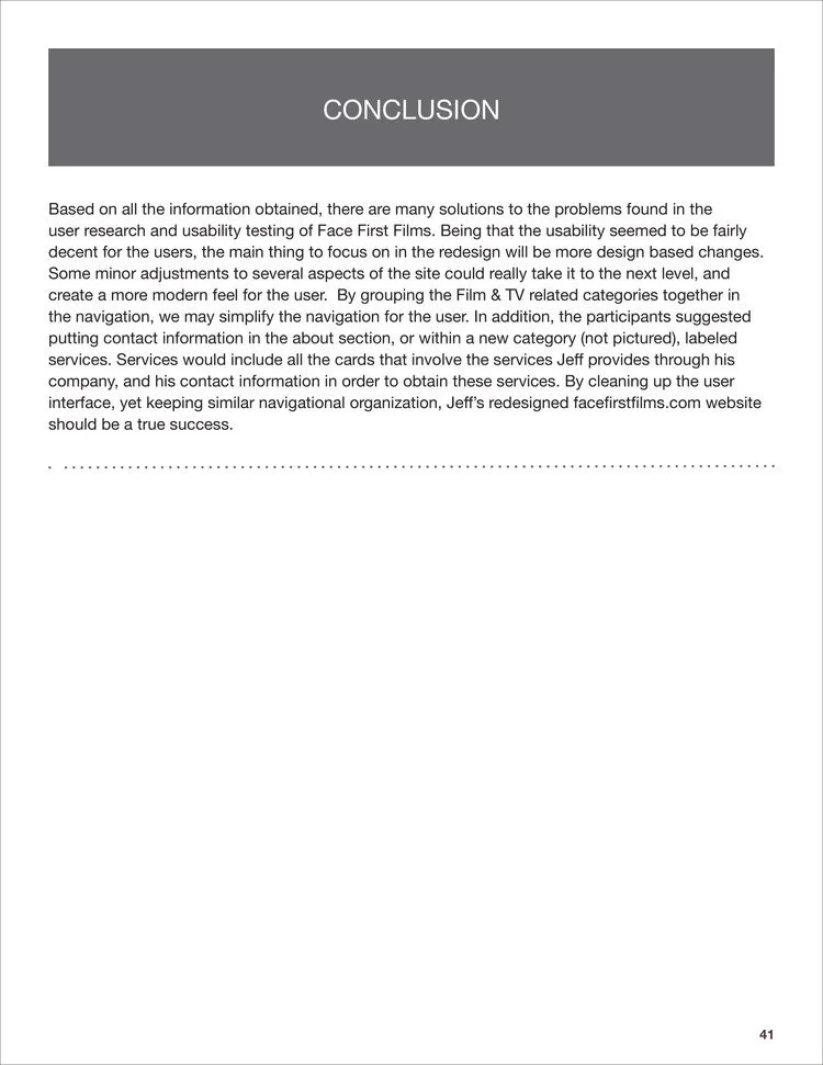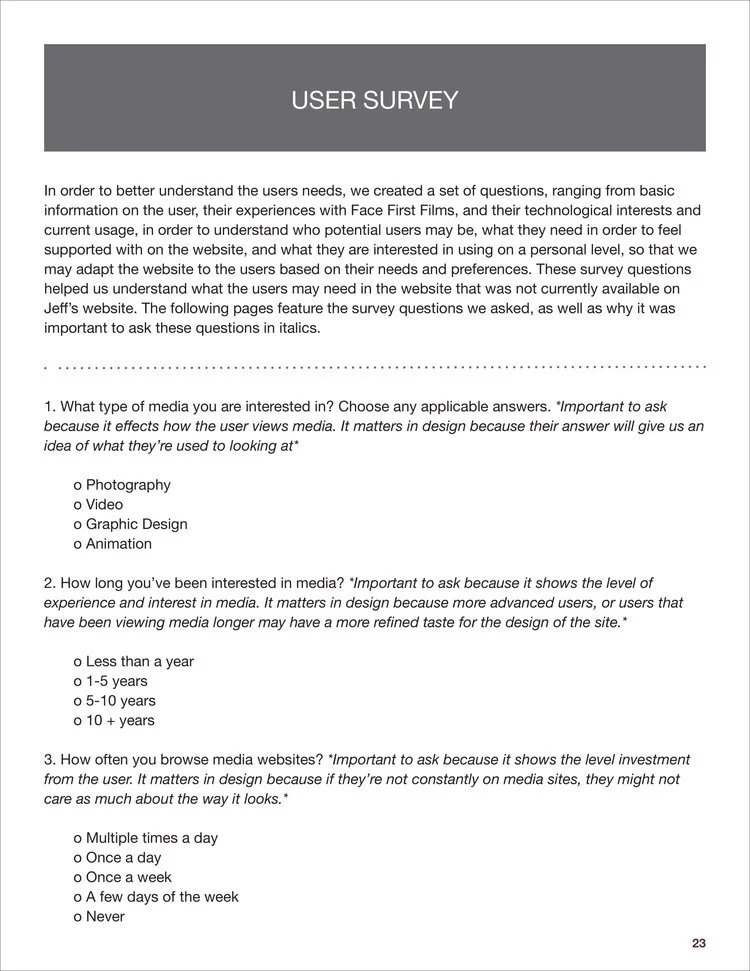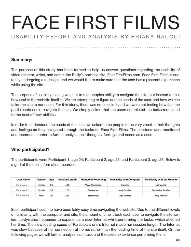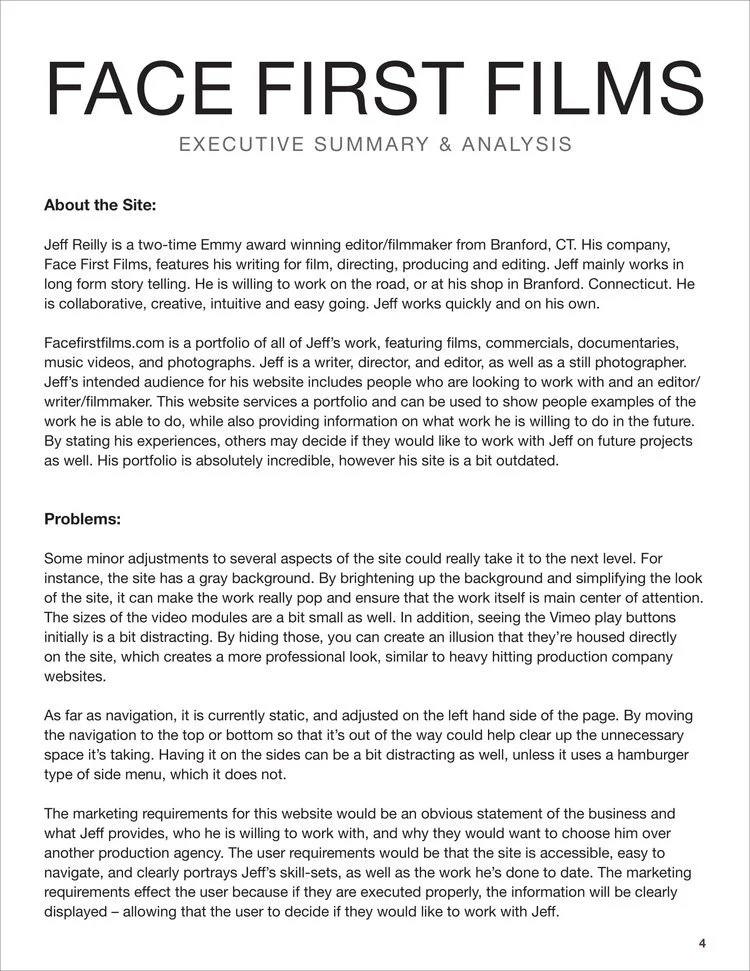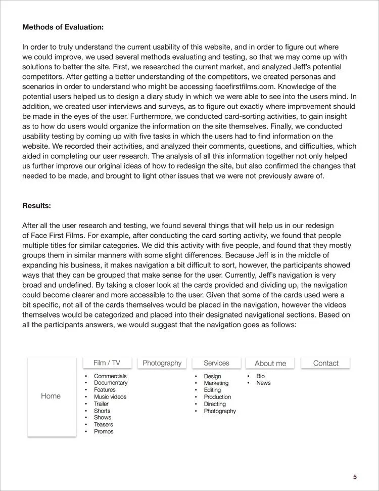 Analyzed and redesigned facefirstfilms.com, the portfolio of Emmy Award-winning film writer, editor & director Jeff Reilly. Prepared a competitive analysis of the site, created user personas and scenarios, designed card sorting activities, conducted usability testing with volunteers, performed diary studies, surveys, and user interviews. After collecting and analyzing the data, redesigned a comprehensive and modern website for the client.