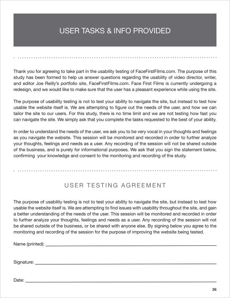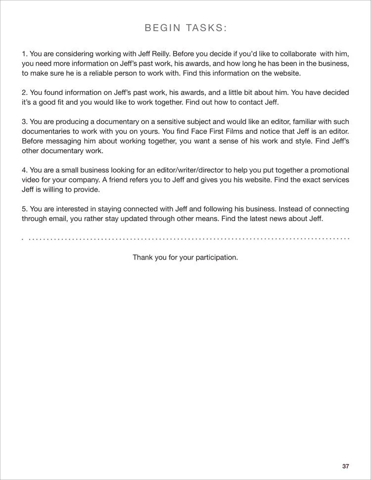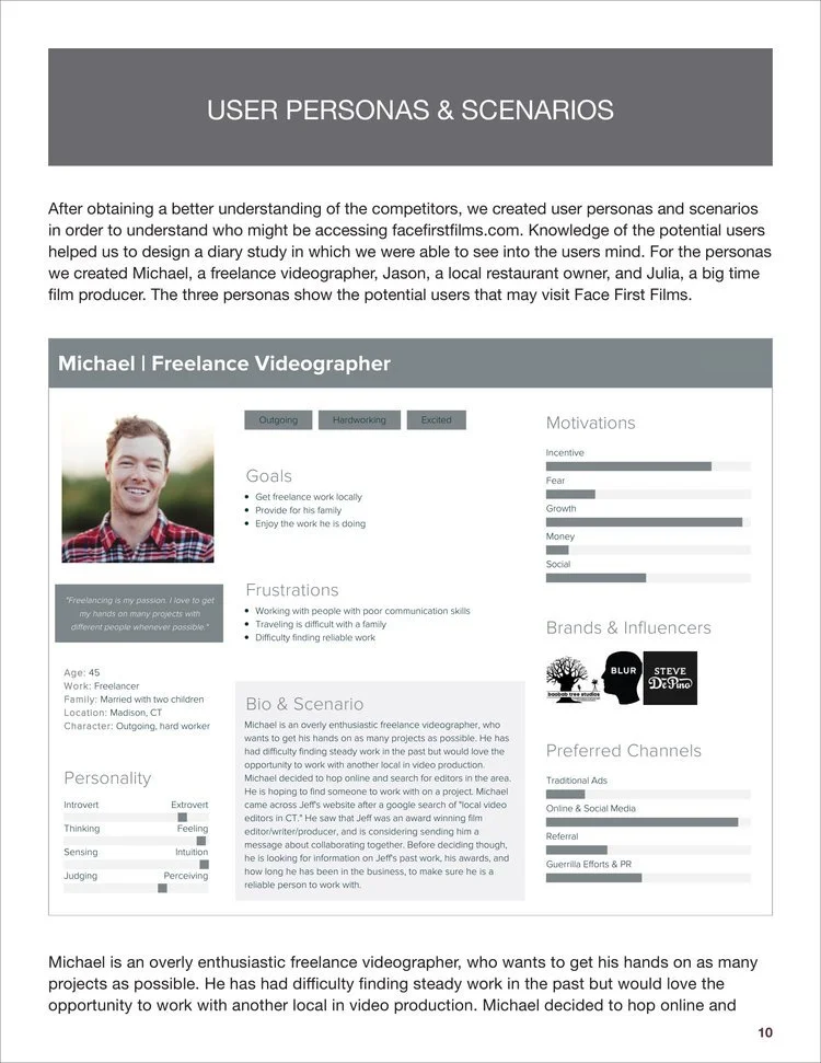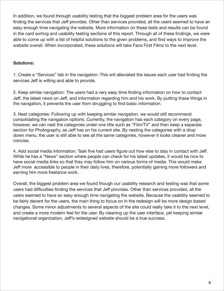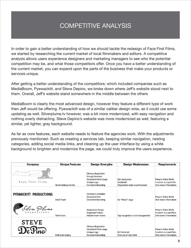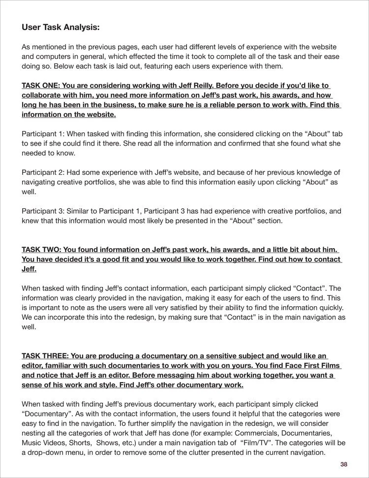 Analyzed and redesigned facefirstfilms.com, the portfolio of Emmy Award-winning film writer, editor & director Jeff Reilly. Prepared a competitive analysis of the site, created user personas and scenarios, designed card sorting activities, conducted usability testing with volunteers, performed diary studies, surveys, and user interviews. After collecting and analyzing the data, redesigned a comprehensive and modern website for the client.