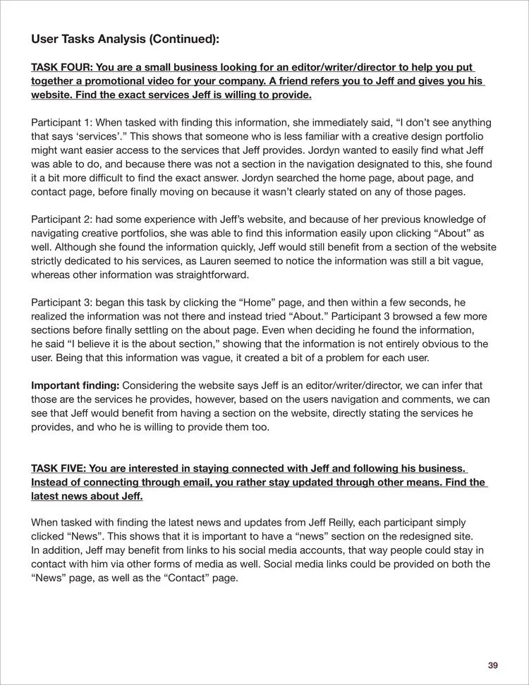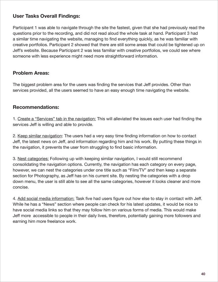 The research allowed me to find opportunities to sort the sections of the website in a clearer way, simplifying the navigation. In addition, I found through usability testing that users had experienced difficulty finding information on Jeff’s services and contacting him for more information.