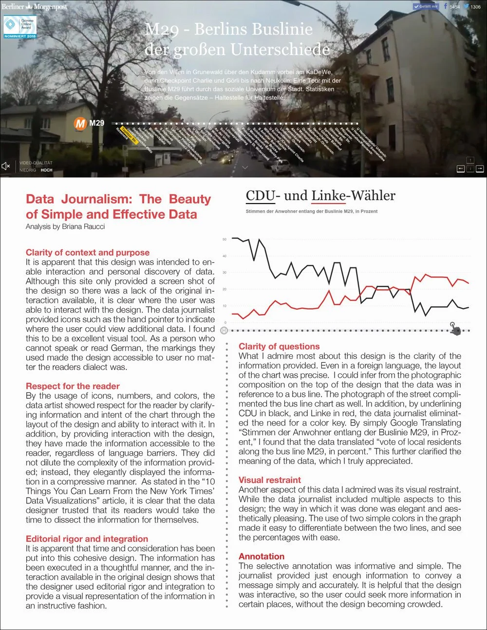 What I admire most about this design is the clarity of the information provided. Even in a foreign language, the layout of the chart was precise. I could infer from the photographic composition on the top of the design that the data was in reference to a bus line. The photograph of the street complimented the bus line chart as well. In addition, by underlining CDU in black, and Linke in red, the data journalist eliminated the need for a color key. By simply Google Translating “Stimmen der Anwohner entlang der Buslinie M29, in Prozent,” I found that the data translated “vote of local residents along the bus line M29, in percent.” This further clarified the meaning of the data, which I truly appreciated.